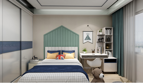兒童房,家具采用白色和薄荷色相互搭配,兩種顏色拼色設計,有一種詼諧的感覺,天真童趣,深受孩子喜愛。