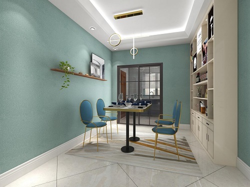 餐廳或許更能代表一個(gè)家的溫度,天然居艾草健康植物漆溫暖的湖藍(lán)色色系,總是會(huì)讓空間變得柔軟舒適。藍(lán)色的環(huán)境也使人感到幽雅寧?kù)o,是一種令人產(chǎn)生遐想的色彩。