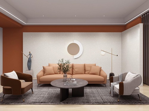 磚紅色和米色的背景墻,造型特別的寫意畫,為客廳的空間奠定了穩(wěn)重大氣又不失品味的基調(diào)。