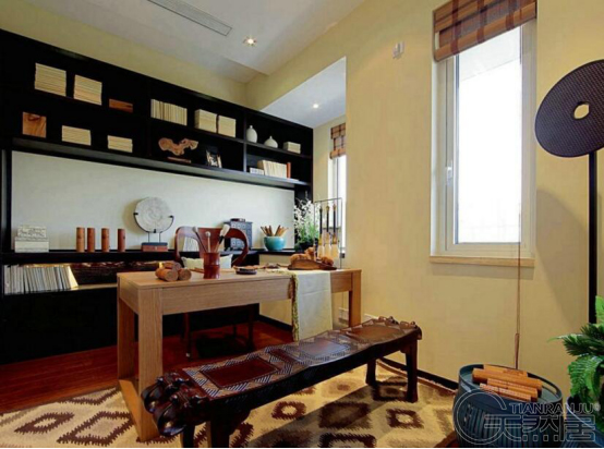 現(xiàn)代硅藻泥書房裝修,清新典雅,給人以生機(jī)盎然的感覺,這是東南亞書房給人的第一印象。帶有編織花紋的小家具襯以堪比壁紙花圖案的硅藻泥背景墻墻壁,充溢異國(guó)情調(diào)。
