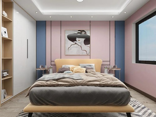 次臥采用藍(lán)灰色+粉色,醞釀著這世間浪漫的語言。